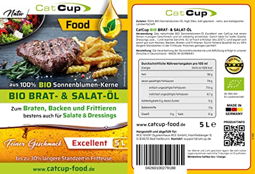 Einzelheiten: CatCup BIO Brat-, Salat- und Speiseöl Typ: EXCELLENT 1 Allgemein:Hervorragendes natives BIO Brat- und Salat Öl für die gehobene Küche. Hergestellt nur aus 100% Sonnenblumen Kernen. Kalt gepresst, vorsichtig filtriert und dadurch mit einem feinen edlen nussigen Geschmack. Ideal zum Braten, Backen und Frittieren bis 220°C, aber auch hervorragend geeignet für Salate, Dressings und kalte Speisen (z.B. Rindercarpaccio).2 Inhalt:BIO Naturprodukt Made in Germany (Bayern) einer regionalen BIO-Ölmühle. Qualität: DE-ÖKÖ-005 zertifiziertes BIO Lebensmittel aus (soweit verfügbar aus regionaler) biologischer Landwirtschaft, HIGH OLEIC (= hoch erhitzbar bis 220°C), NATIV, feiner Geschmack. Rauchpunkt bei ca. 230°C. Damit ideal auch zum Frittieren und scharfen Anbraten. Perfekt auch für Popcorn, Fondue, Raclette und Marinaden (Grillfleisch). Durch die hohen Temperatureigenschaft auch für Smoker geeignet.3 Fritteuse:Fritteuse: Gastronomen bestätigen deutlich weniger Schaumbildung, weniger Geruchsentwicklung und bis zu 30% (!) längere Standzeit des Öls. Tipp: Frittieren bei maximal 185°C empfehlen die Küchen Profis! 4 Gebinde:Erhältlich in 1 Liter nachhaltigen Metall Dosen oder 5 Liter Kanistern aus 100% recycelbaren Kunststoff. Tipp: Das Öl kann leicht in kleinere Glasflaschen umgefüllt werden für den täglichen Gebrauch. Geöffnet ein Jahr haltbar (vor Sonne und Wärme schützen). Größere Mengen auf Anfrage lieferbar. 5 ZusammenfassungCatCup Brat & Speise Öl EXCELLENT ist das perfekte Allrounder Öl für alle Anwendungen in Küchen mit Wunsch zu Qualität. Feiner edler Geschmack und High Oleic Temperatureigenschaften – und dazu noch gesundes BIO. Wir wünschen Ihnen viel Freude mit diesem Produkt, und *DANKE*, dass Sie die BIO Landwirtschaft mit diesem Kauf unterstützen!&